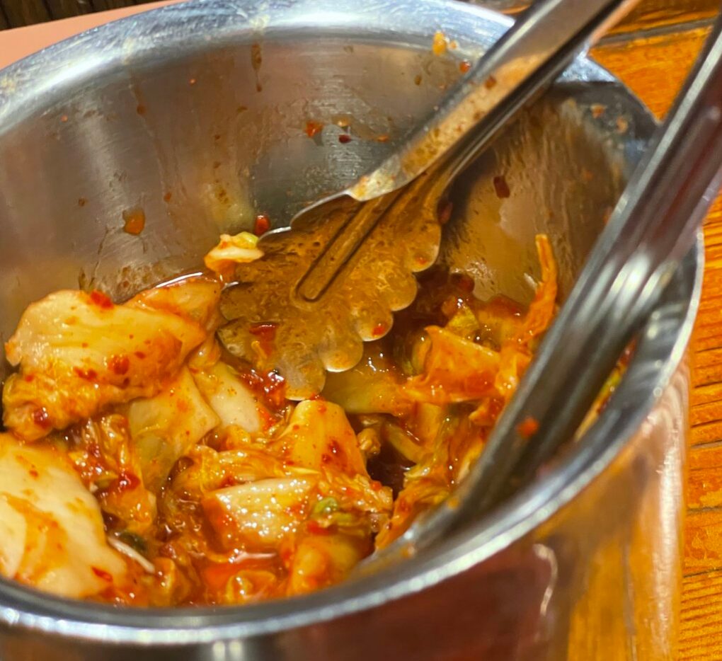 驚くべきは、この物価高騰が続くご時世にもかかわらず、このクオリティのキムチが今もなお「無料」で提供され続けていること。 (もう、これだけで頭が下がります…!)