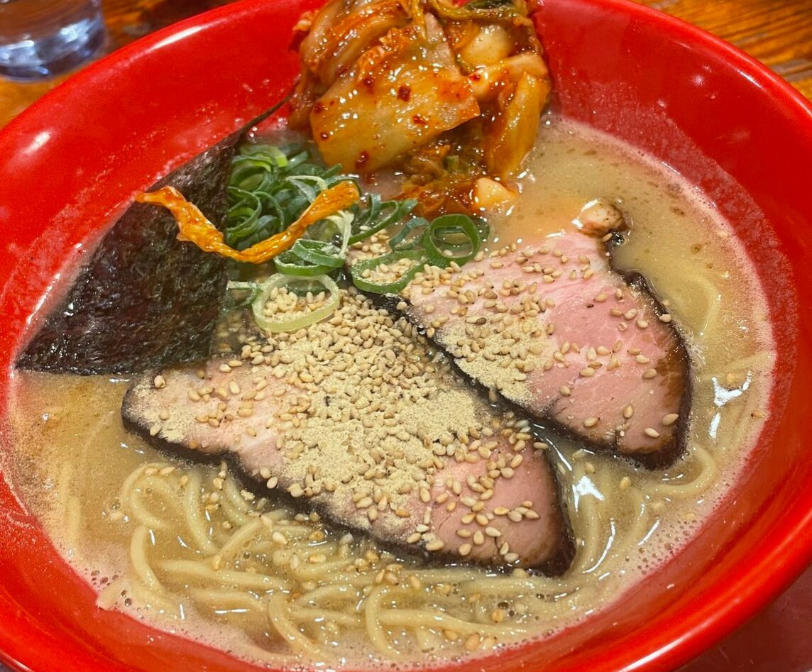 そして、もう一方が注文したのが、こちらの「トマトラーメン」。「ラーメン屋でトマト?」と侮るなかれ。 これが、驚くほど本格的で、めちゃくちゃ美味しいんです!真っ赤なスープは、まさに「飲むイタリアン」。 トマトのフレッシュな酸味と甘み、そして恐らくベースとなっている豚骨スープのコクが、完璧に融合しています。具材には、とろけるチーズ(※トッピングやメニューによる)や、場合によってはバジルが香り、もはやスープパスタのようなリッチな味わい。「これ、ラーメンの麺と合うの?」 はい、めちゃくちゃ合います。 むしろ、この濃厚なトマトスープに負けないよう、麺の存在感が際立ちます。